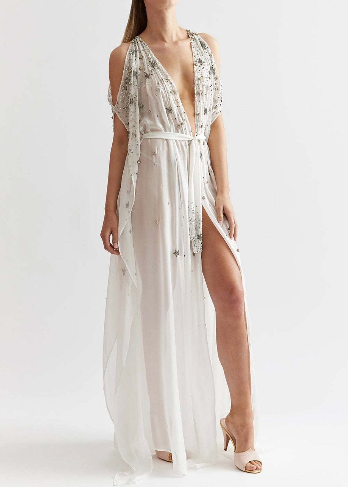 Cut-out, off-shoulder detail provides for a delicate and sensual exposure of skin amongst the heavenly jewels. Silk chiffon floats to the floor, while a bejeweled sash ties at the waist, allowing for a plunging neckline and sliver of elongated leg.