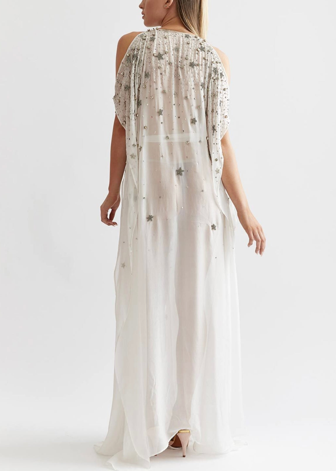 Featuring the celestial motif prominent in 1930’s silver screen style, the Stellar Celestial Kaftan evokes bygone era decadence thanks to intricate and elaborate details and a flattering cut for all. Silver metal sequins, crystals and stars have been meticulously hand sewn and appear to fall, scattering upon the shoulders and décolleté.