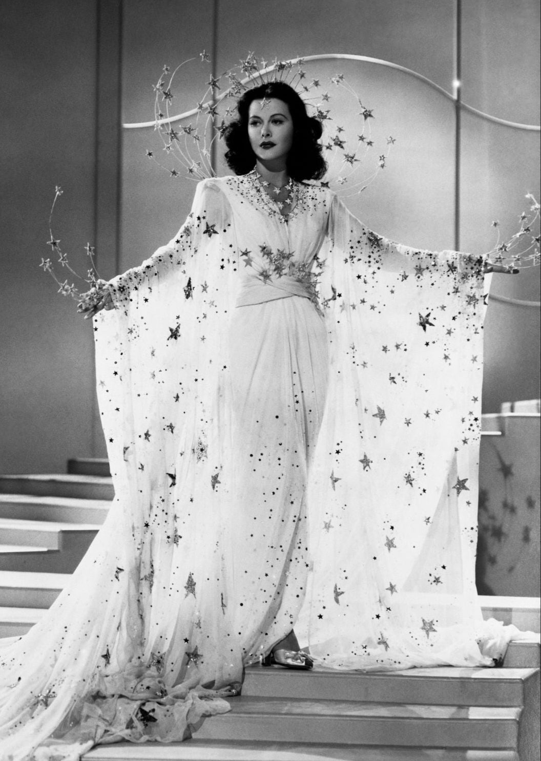 The Celestial Goddess Kaftan is constructed from premium silk chiffon, embellished with a constellation of hand-applied crystals, beads and sequins. This show-stopping piece is a boudoir nod to Hedy Lamarr's iconic "Ziegfeld Girl" look!