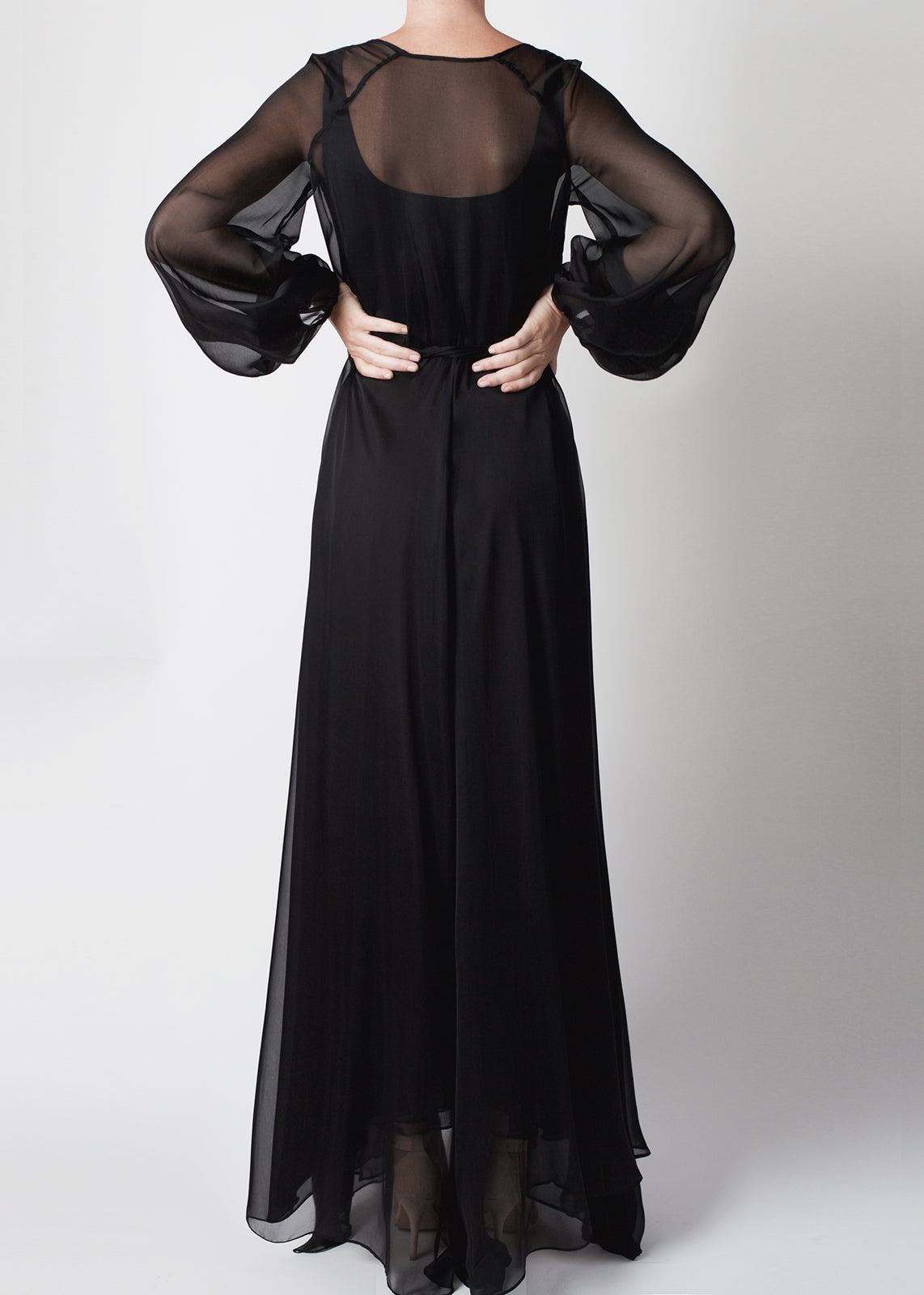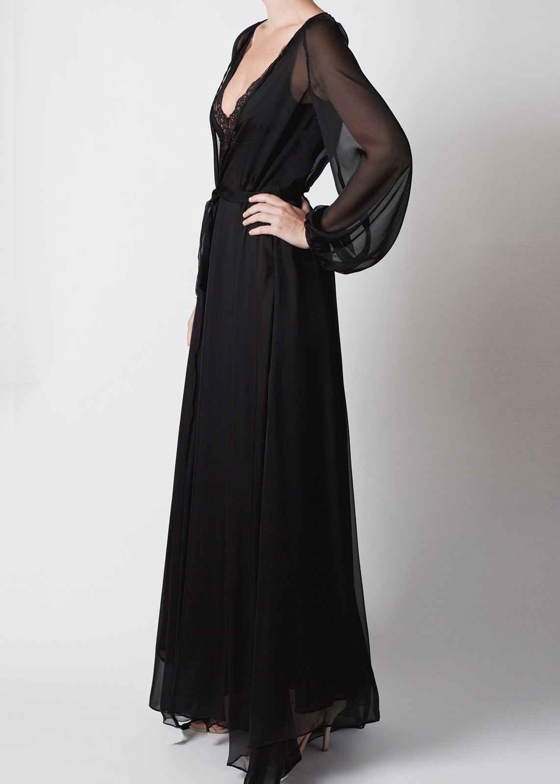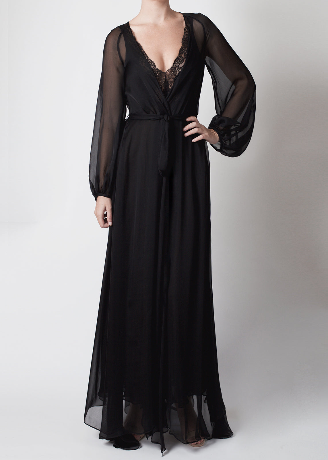 Every goddess, modern day or silver screen, needs a timeless and universally flattering robe. The Stellar Silk Robe is it constructed from a superior quality silk chiffon. Floor-skimming, it floats around the wearer with heavenly effect. Dramatic and delicate, this robe features a full skirt and sleeves, that make a statement while remaining completely wearable. The Stellar Robe is an exceptional piece of loungewear, whether worn on its own, with lingerie, over one of our camisoles or outerwear for an inimitable dash of glamour to any ensemble.