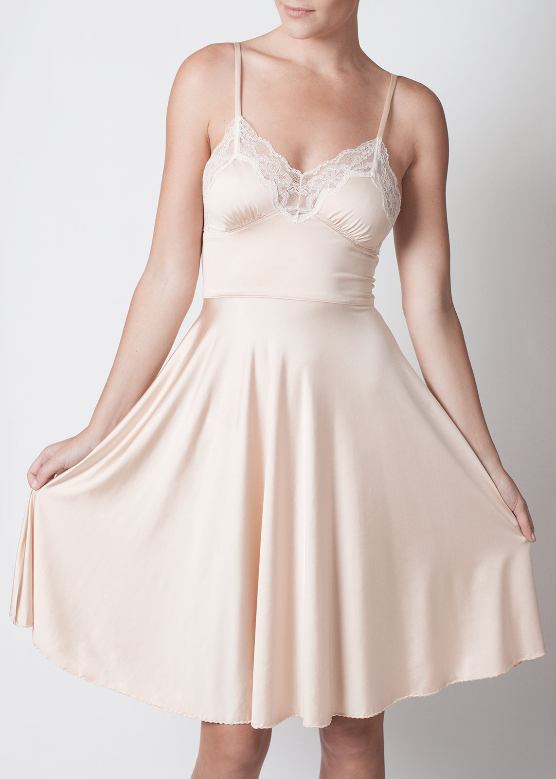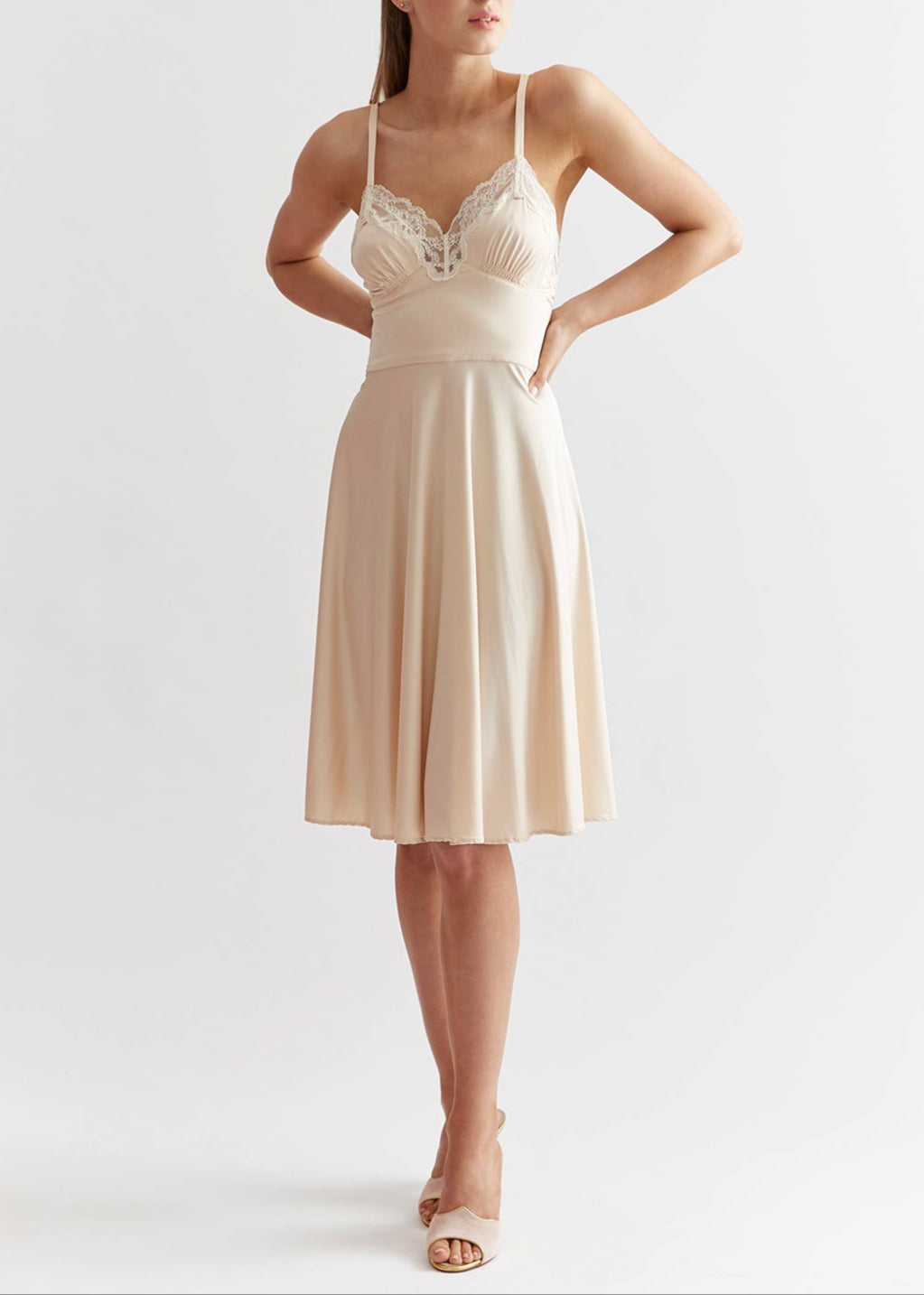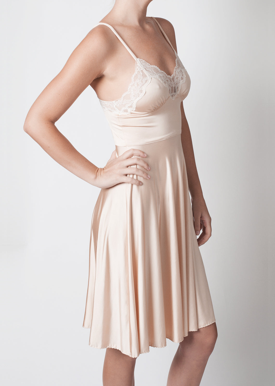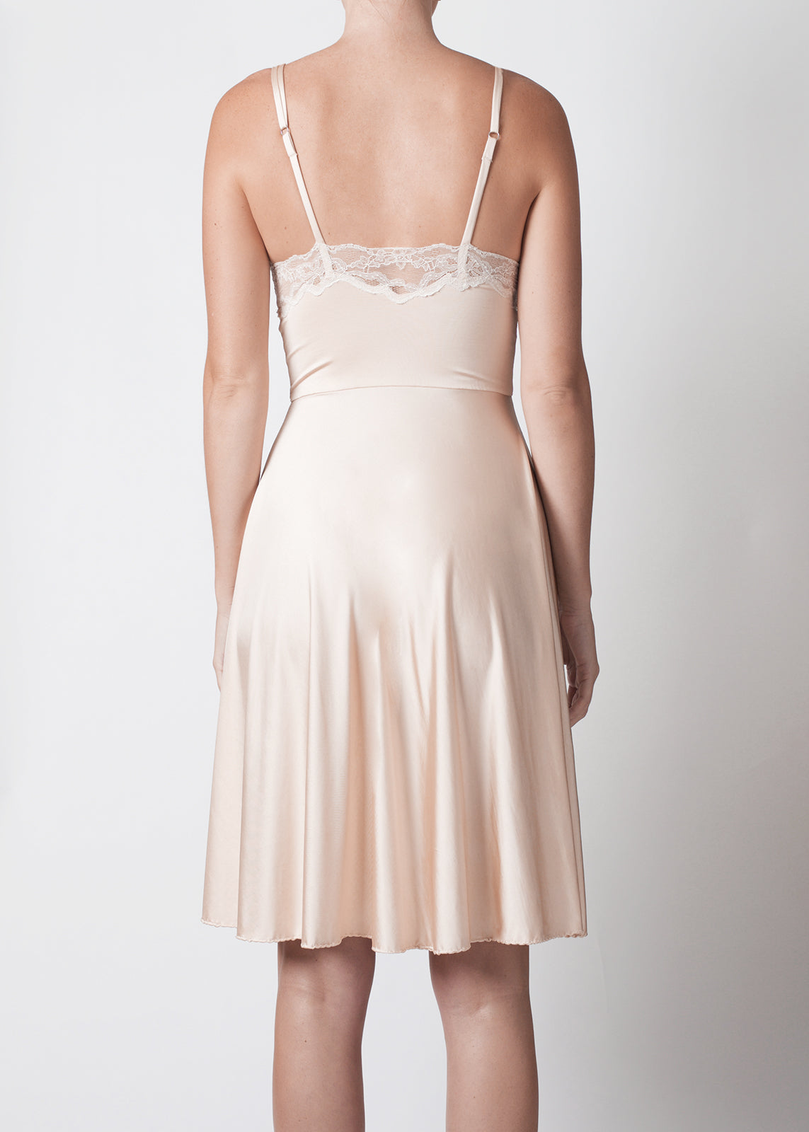 Our Harlow Midi Slip is the midi-length style of our eternally beautiful 'Harlow' collection. This versatile style is the epitome of timeless appeal and doubles both as a smooth and supportive foundation garment and a boudoir look on its own. The luxurious Austrian satin stretch jersey caresses the body, enhances the silhouette and features the 2-ply bodice and cup of 'Harlow's' Camisole and Long Gown counterparts. Our delicate and soft French lace is the perfect trim, adding yet another heavenly sensation to a garment that is a pleasure to wear.