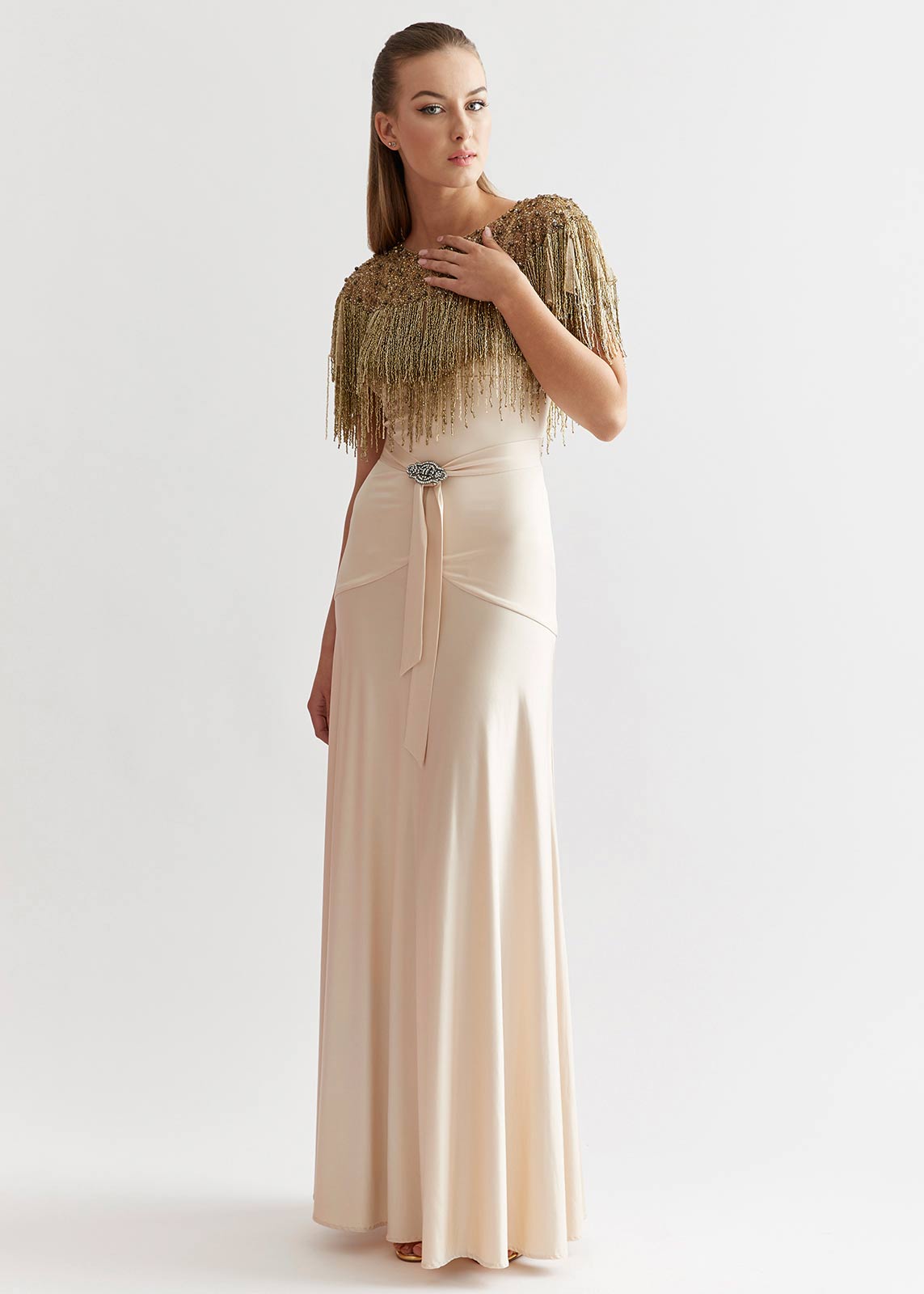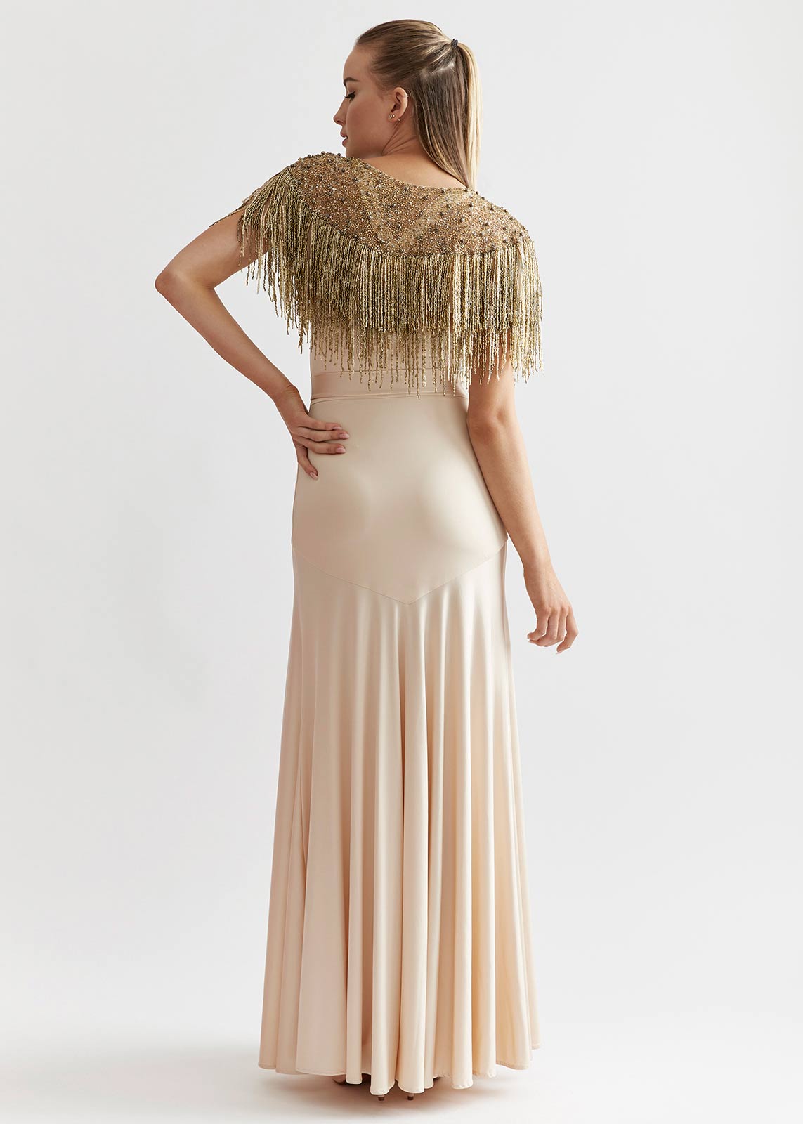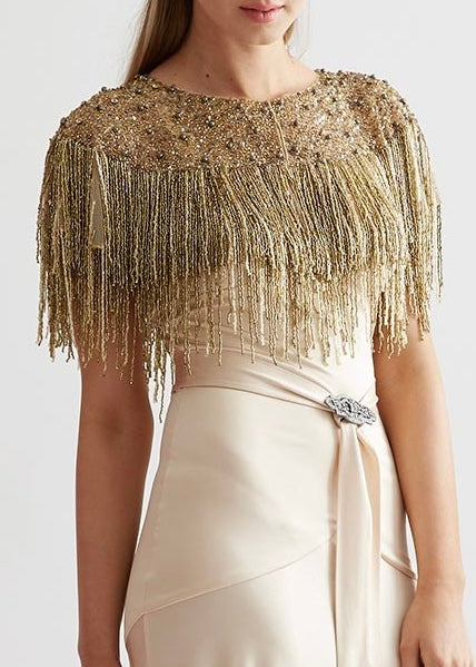 Josephine is a scene-stealing piece of true, high-end vintage quality. Inspired by 1930s flappers and Parisian burlesque, this cape is constructed from a sheer tulle base and heavily embellished with antiqued, gold glass beads. These beads culminate in a glittering, multi-layered, dense fringe trim. Josephine is the kind of dream piece you wish you found in your former showgirl grandmother’s attic- the magical kind of garment that elevates every outfit to ‘exceptional’ as it shimmies and shines around your shoulders with every movement. This cape can be worn open or fastened at the collar and is inspired by Josephine Baker's showstopping stage looks. Layer over dresses for evening-wear flair or add to lingerie or loungewear for a boudoir look of incomparable opulence.