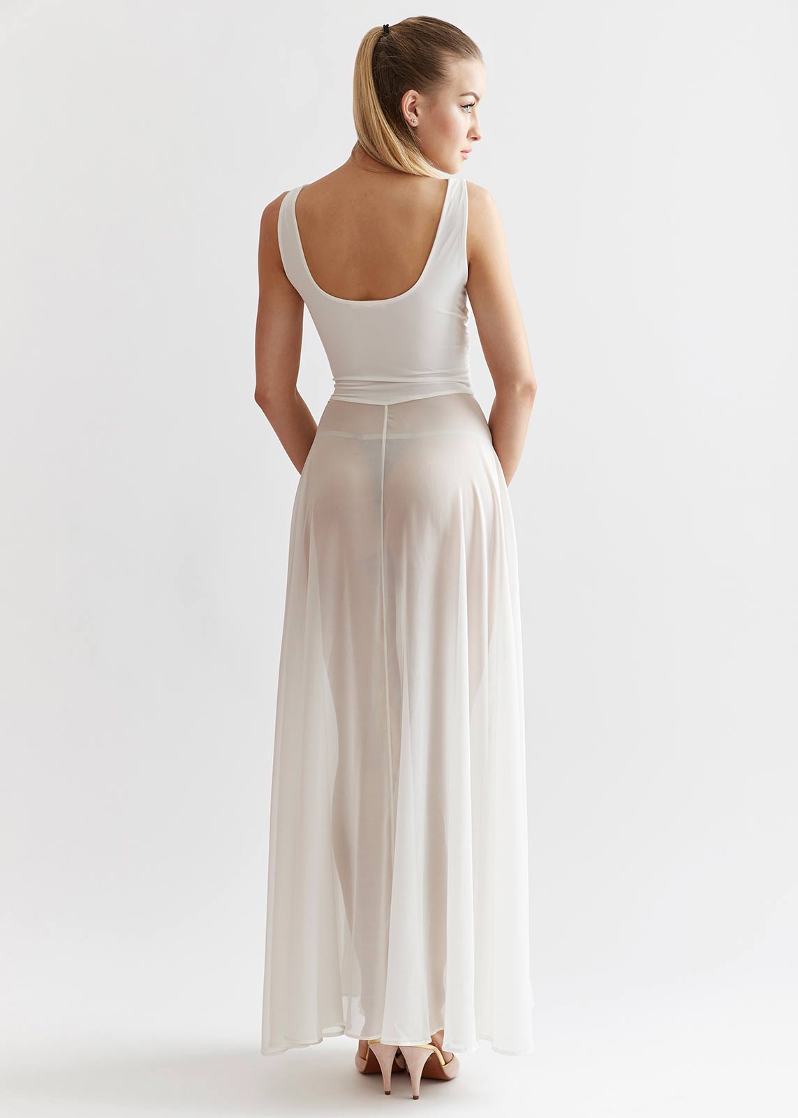The bodice of this gown is stretchy and supportive. Because of it's body hugging properties it is snug to get over the shoulders. Resist the temptation to pull the garment down by the skirt, as it will tear the delicate silk chiffon. One of the main features of this garment is the built-in sling to support the bust. When putting the gown on, pull the breast tissue up, so that it sits above the sling in the cup.