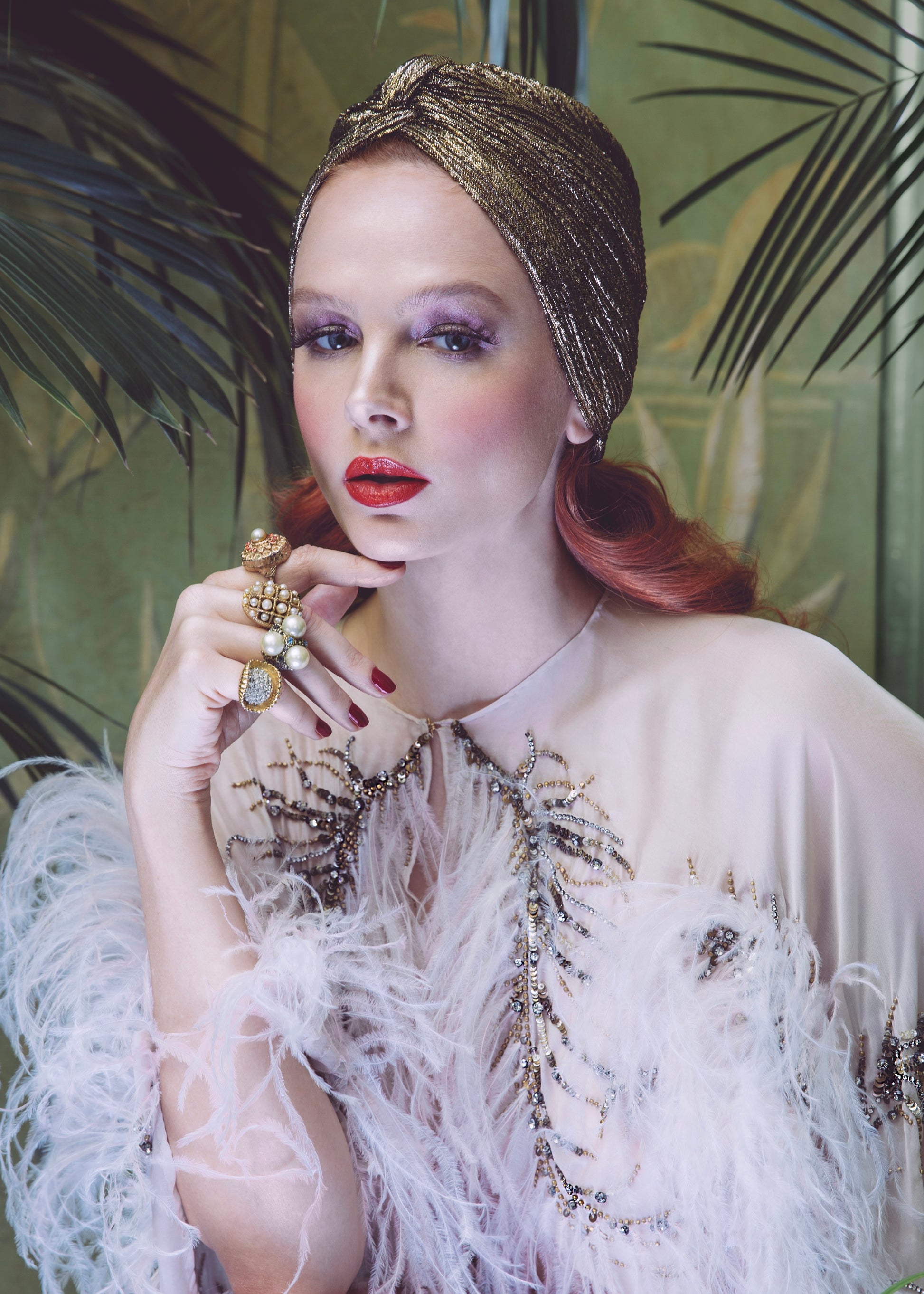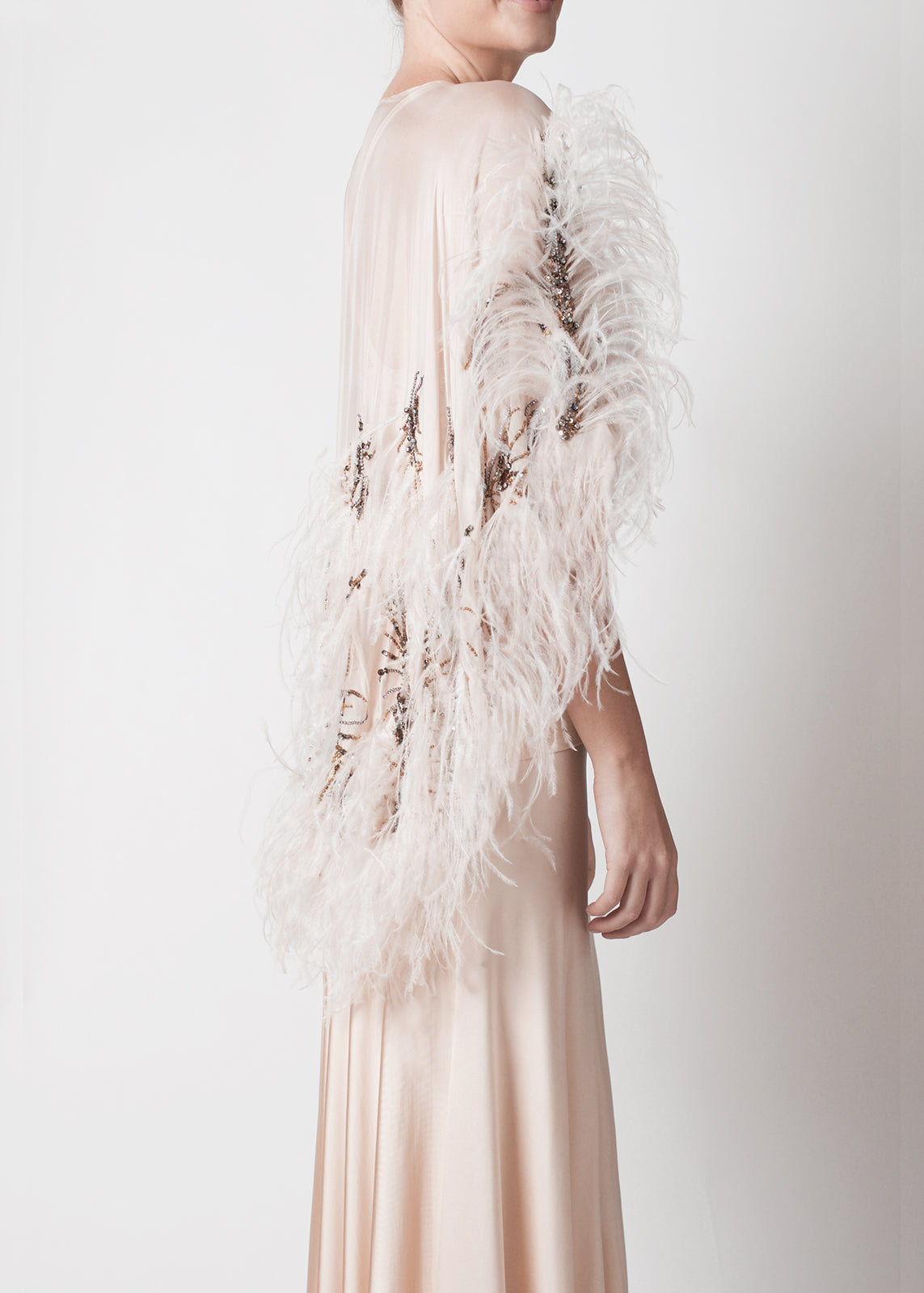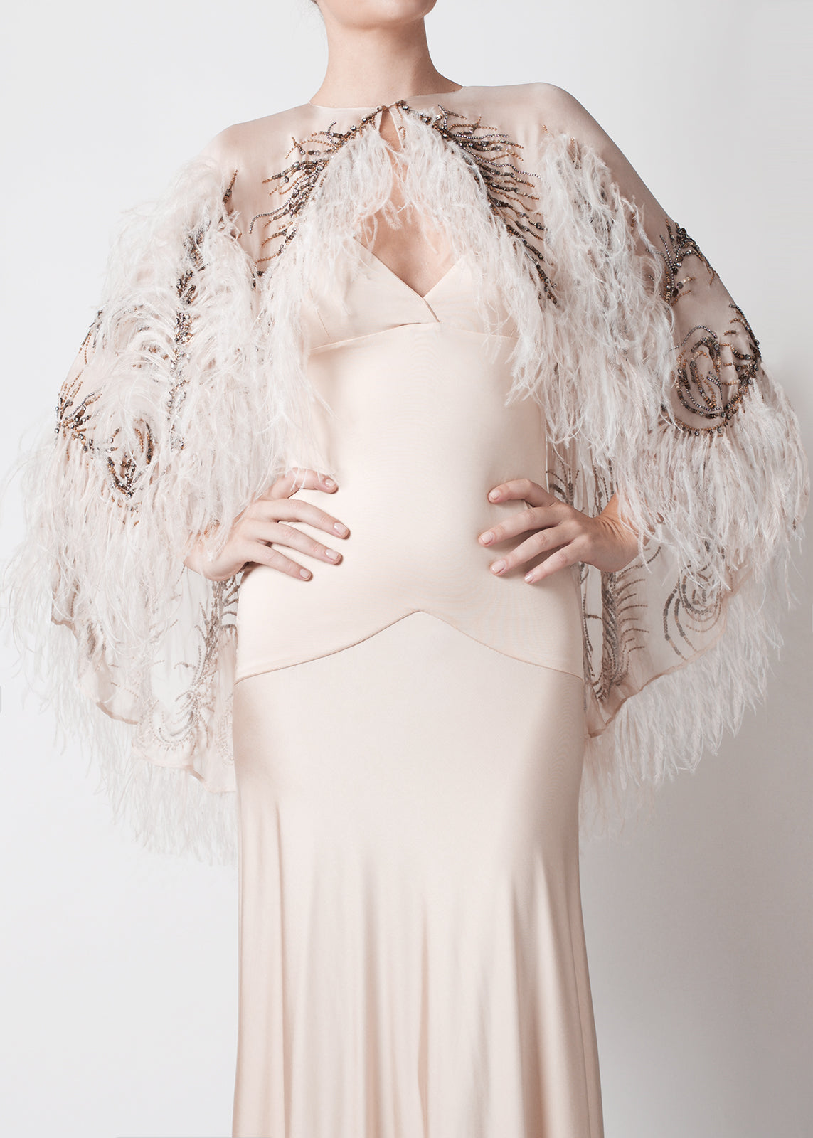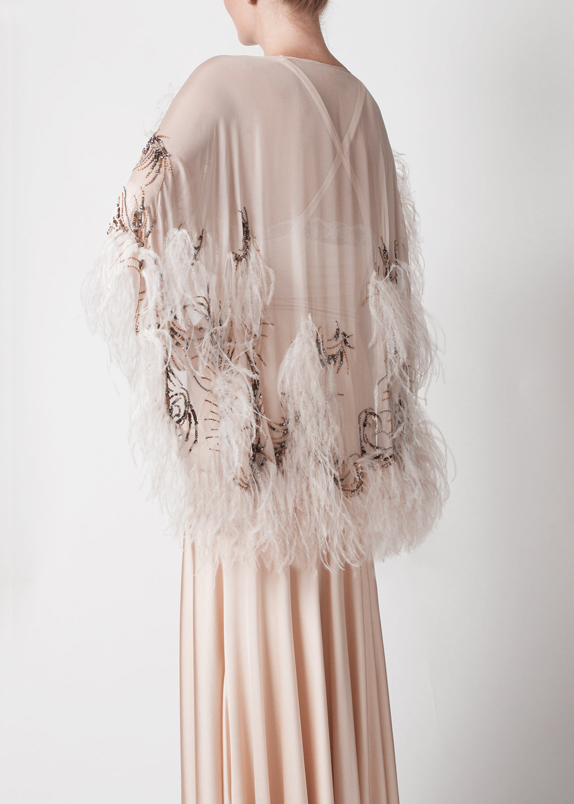 An extravagant garment not for the faint of heart, our Stellar Plumes Cape is the perfect flourish of glamour for any outfit- bridal, boudoir or red carpet This classic cut cape fastens delicately at the neck and falls over the shoulders in a voluminous cascade of exquisite materials. The softest silk chiffon is hand embellished with an intricate plume motif, consisting of glimmering crystals, beads and vintage metal sequins and meticulously individually placed ostrich feathers. Wear fastened or opened, over an outerwear ensemble or paired with one of our Harlow slips for full show-stopping effect. A head-turning and truly unique garment, the Stellar Plumes Capele is a wearable objet 'dart.