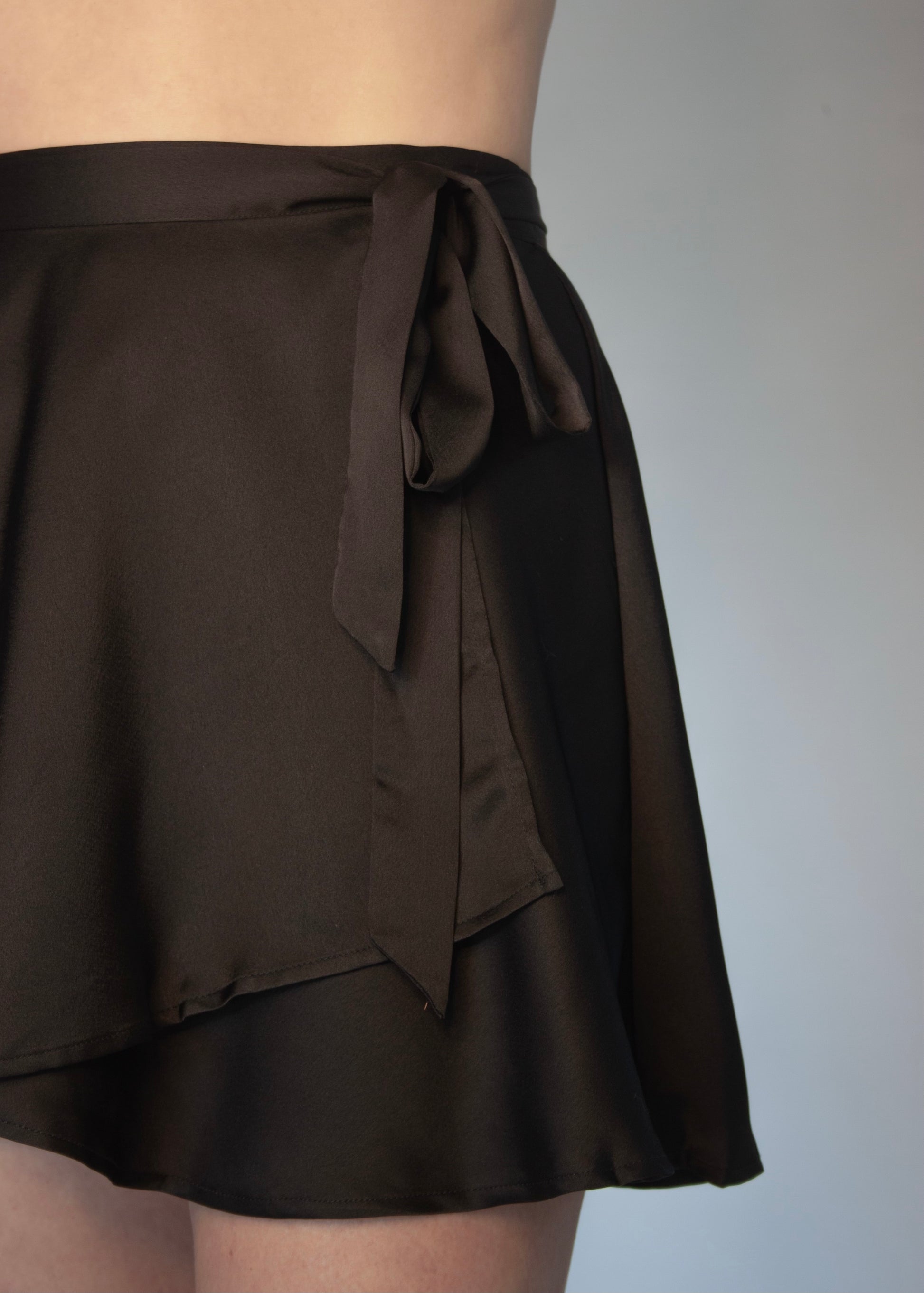 Crafted from lustrous satin, this mini-length wrap skirt moves with fluid elegance and catches the light with every step. Its fully adjustable design ties at the waist in a sweet, feminine bow, allowing for a custom fit that flatters every figure. Whether layered over lingerie, styled for a night out, or worn as a dreamy lounge look, the Margot Ballet Skirt is a touch of refined romance.